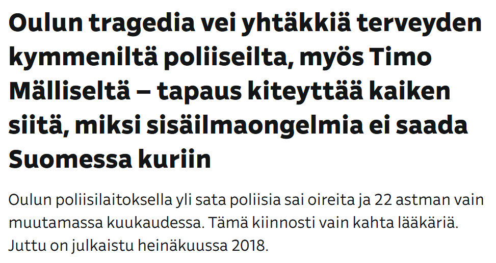Toinen näistä tutkimuksista koskee Oulun poliisilaitosta, jossa suuri joukko poliiseja sairastui lyhyen ajan sisällä. Yle teki tapauksesta laajan jutun vuonna 2018. Sairastumisten syiden selvittely kiinnosti lähinnä vain poliisien työterveyslääkäriä. 13/ yle.fi/a/3-10254105