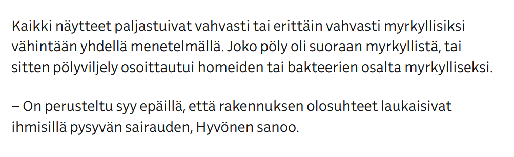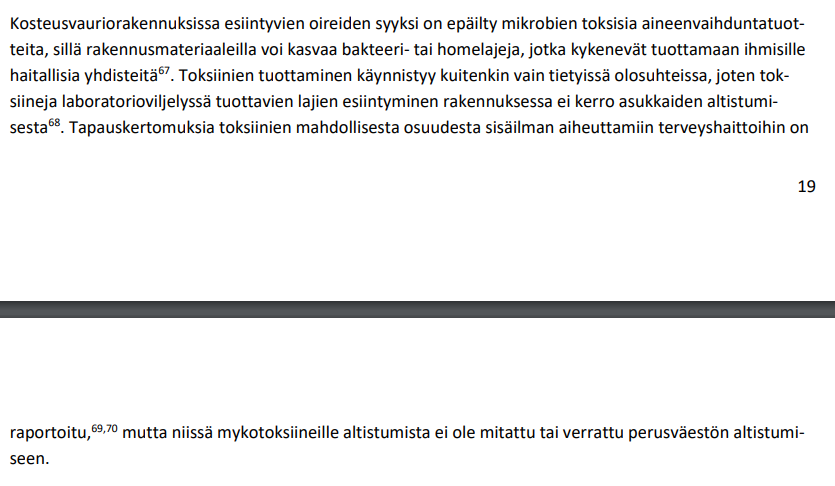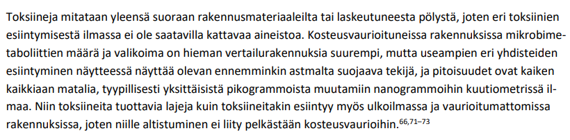 Seuraavaksi kerrotaan, että toksiineja on epäilty oireiden aiheuttajaksi. Tämä on varsin vähättelevästi ilmaistu, kun samalla viitataan artikkeliin, jossa n. 150 tutkimusviitteen avulla käydään läpi tiedon tasoa kosteusvauriomikrobeista, toksiineista ja vaikutusmekanismeista. 9/