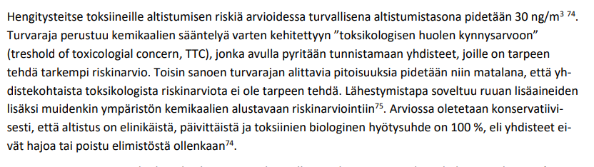 Lähteessä 30 ng/m3 arvon käyttämistä erilaisten teollisuuskemikaalien yhteisaltistumisen turvarajana perustellaan sillä, että kemikaalikohtaiset, turvallisena pidetyt altistumistasot ovat järjestäen kaikki suurempia kuin kyseinen 30 ng/m3 arvo. 27/