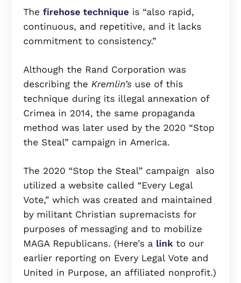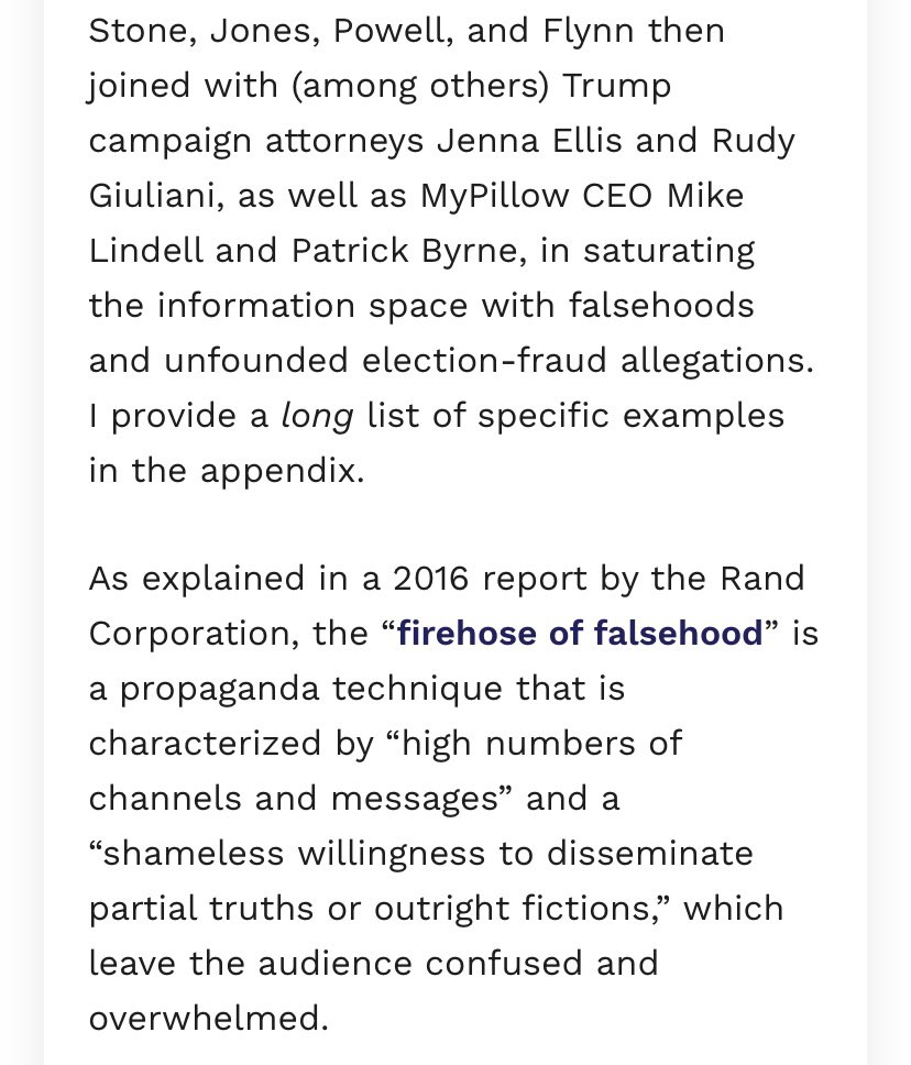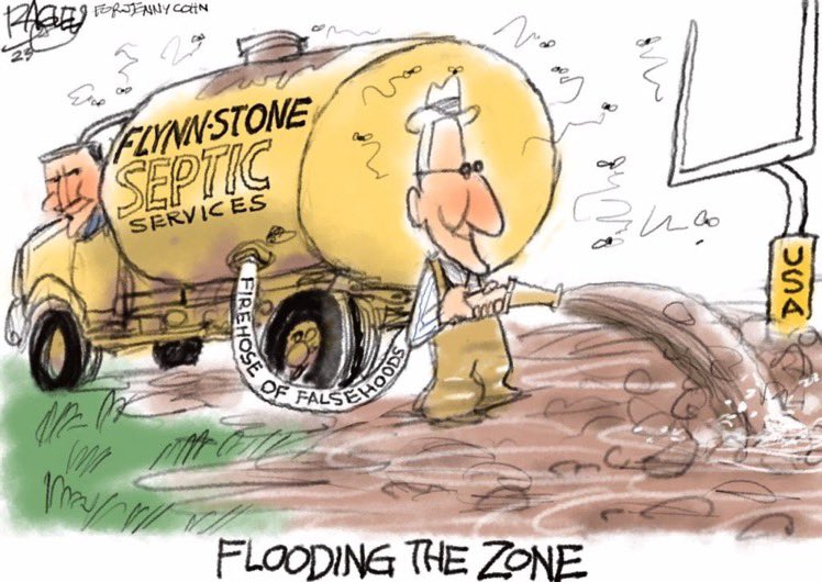 Roger Stone & his cohorts, such as Mike Flynn, Alex Jones, & Sydney Powell, used a “Russian propaganda technique called the ‘firehose of falsehood.’ As soon as one claim is debunked, another replaces it, creating a 24/7 tsunami of information warfare…” 1/ buckscountybeacon.com/2023/10/trump-…