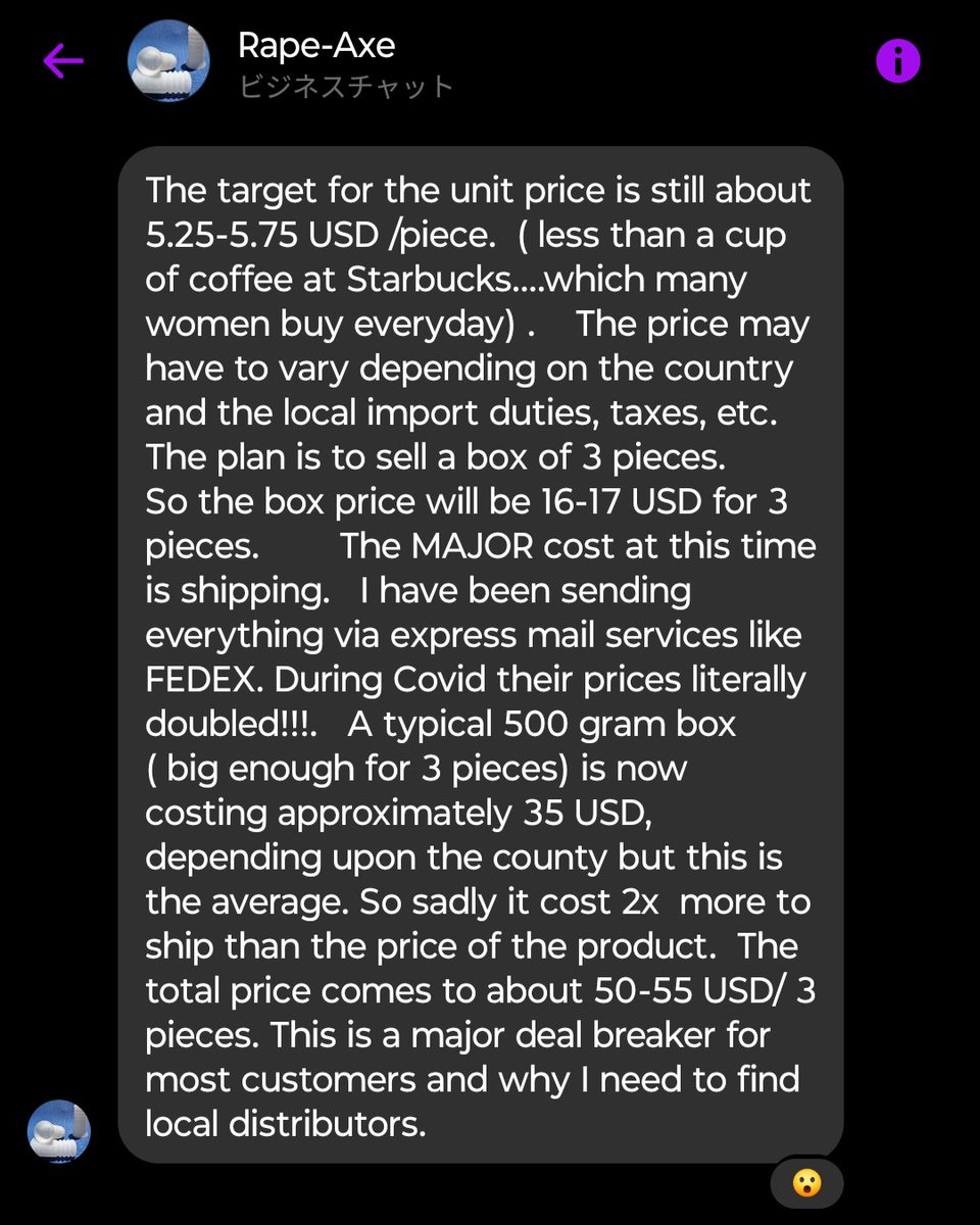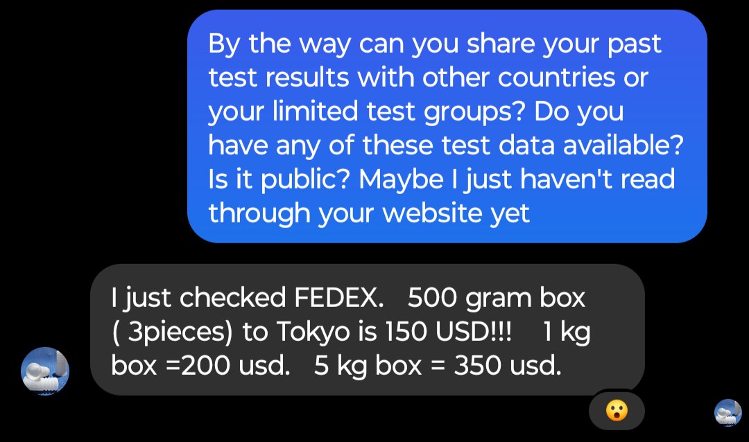 「若い人たち特に学生さんには今の価格設定でも高すぎると言われた」と伝えたら、「10個50ドルは維持できるかもしれないが、その分重量がかさむので 送料も50ドルかかり総額100ドルになると予想される」と回答いただきました。送料込みといえこのご時世で100ドルは流石に高いですかね…😔 Image