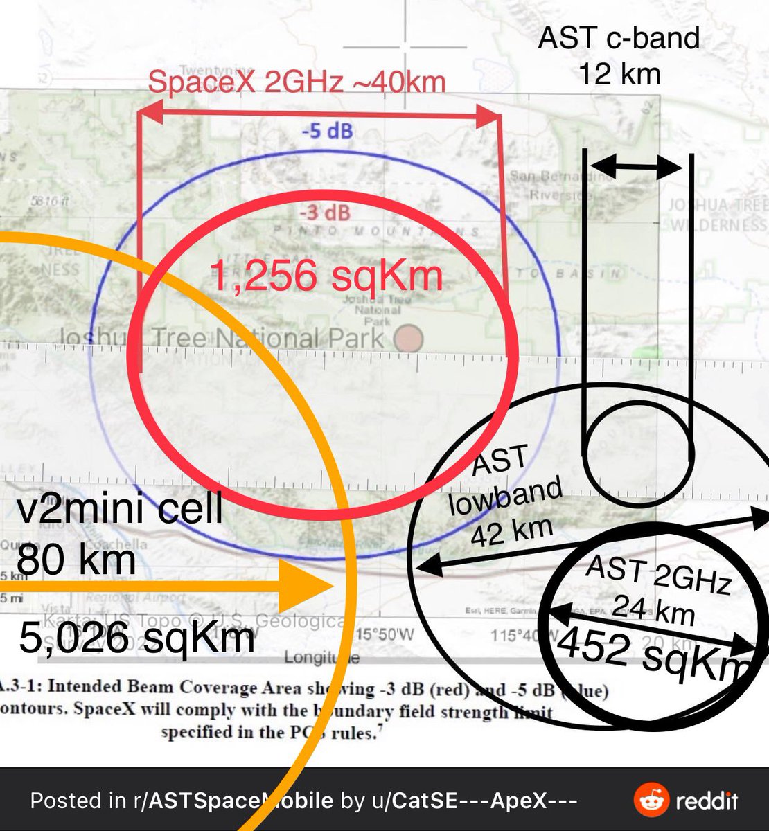 2GHz / s-band cells to s-band cells then an 80km wide Starlink cell compares to an 24km wide AST s-band cell not like the duameter (4-1.)