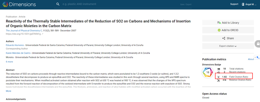 Acceder a indicadores similares como el Field Weight Citation Impact o el Field Citation Ratio es mucho más sencillo. En el caso de #Scopus, la mayor parte de las bibliotecas tienen suscripción y en el de #Dimensions, la consulta de este (y otros indicadores) es gratis