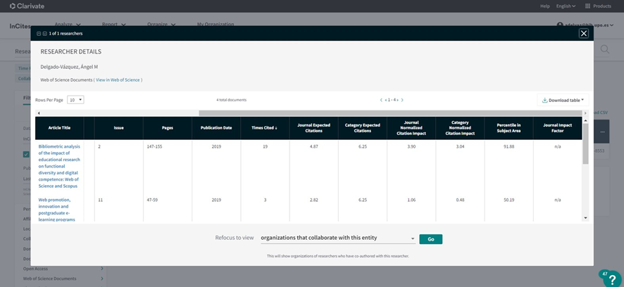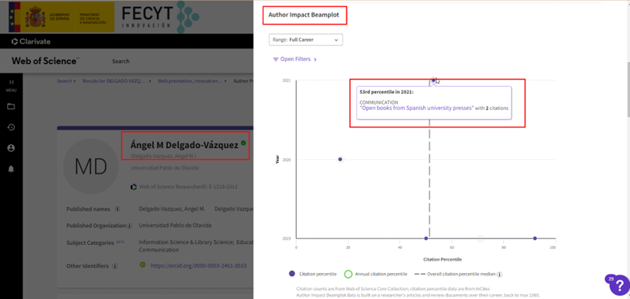 Este tb puede consultarse, incluso con mayor nivel de detalle, en los perfiles de autor de WoS (Publons/ResearcherID). En ellos, además de afinar mejor el percentil, también hay un mayor nivel de granularidad temático, lo cual lo convierte en una opción muy interesante.