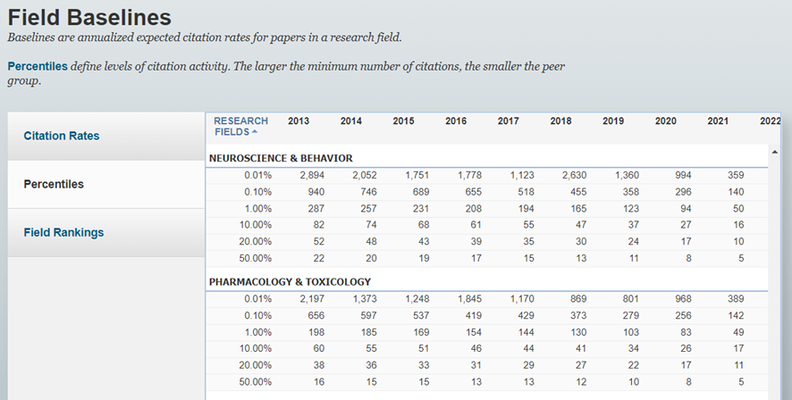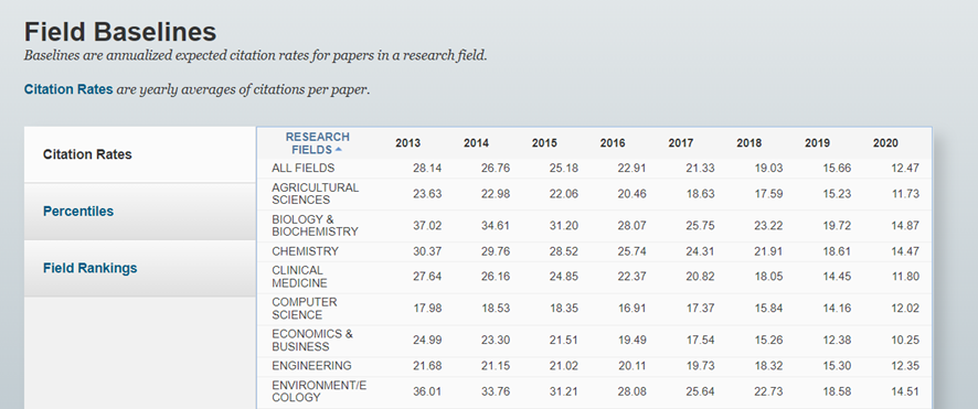 En el entorno WoS hay 2 indicadores más basados en citas que se pueden usar para dar contexto. Por un lado, Citation Rates, las tablas que informan de la media de citas recibidas por los trabajos publicados, por categorías temáticas y fecha de estos (llega hasta 2023):