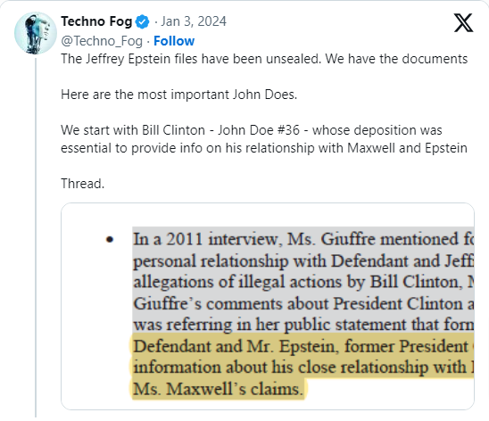 ABC News revealed prior to the release that Clinton will be revealed in the court records without being connected to any illegal actions. When Epstein's flight logs were made public in 2021 over the protracted legal dispute between Giuffre and Maxwell, his name was mentioned multiple times.dailycaller.com/2024/01/03/bil…