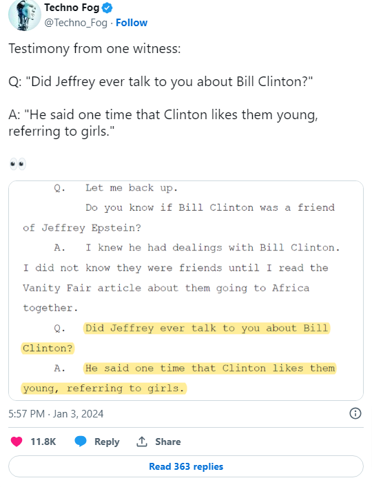 Epstein Jeffrey Says Victim, "Prolific Pedophile" Bill Clinton "likes them young".
