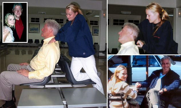 The girl in this photo was trafficked by Jeffrey Epstein and was forced to serve the rich and powerful, namely Bill Clinton. She is the woman who was photographed giving Clinton numerous massages on the Lolita Express.