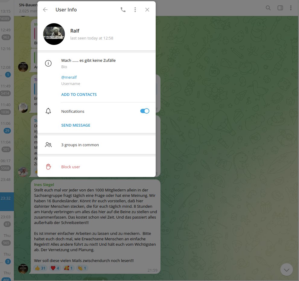 Derselbe User und Admin Ralf der im QAnon/Fascho-Telegram Kanal Zeitzeugen M u.a. auch die Audios und das Video zu #Habeck veröffentlichte, hier als Admin in einer sogenannten "Bauern"-Gruppe #NoAfD #AfD Wir aber noch besser! Image