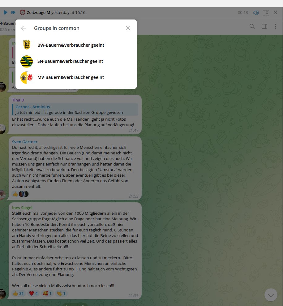 Nicht verwunderlich ist die Tatsache, dass alle Gruppen -Admins der sogenannten „Bauerngruppen“ auch gleichzeitig in Rechtsextremen/QAnon Administratoren sind, hier einer der Administratoren der Satanisten/QAnon Gruppe Zeitzeugen M der gleichzeitig in Amin in "Bauern" Gruppen ist