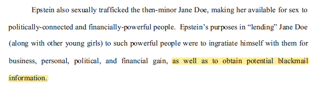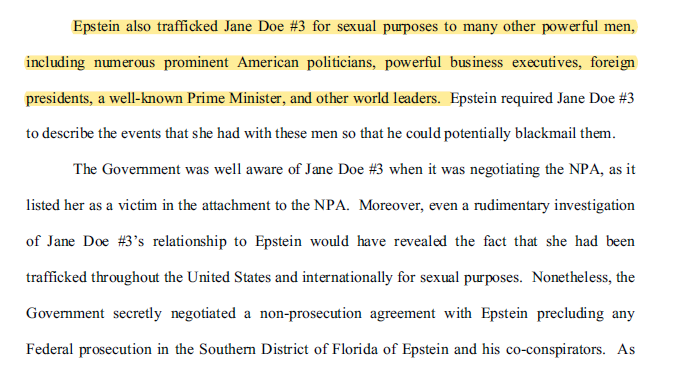 Epstein sexually trafficked her to "prominent American politicians, powerful business executives, foreign presidents, a well-known Prime Minister, and other world leaders."