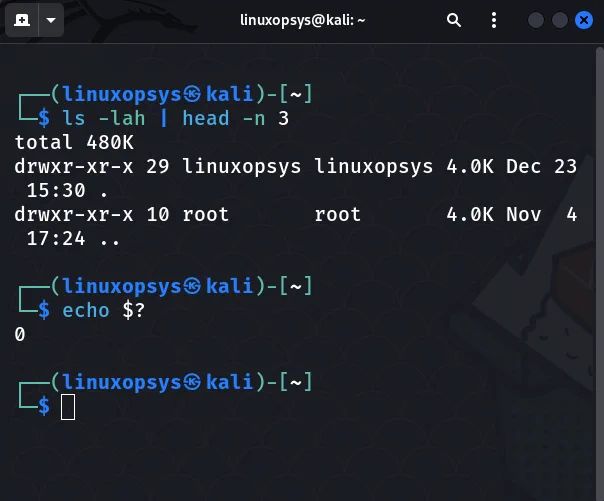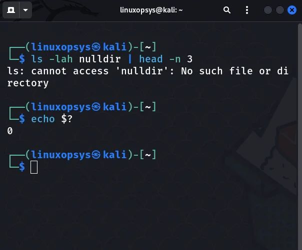 In the preceding example, echo $? prints the exit code of the head command and its zero. To prove this, execute the ls command on a non-existent directory.