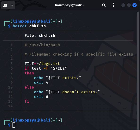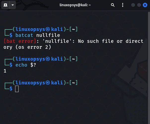If you attempt to run batcat command on a not-existing file, the exit code will be non-zero as shown below: