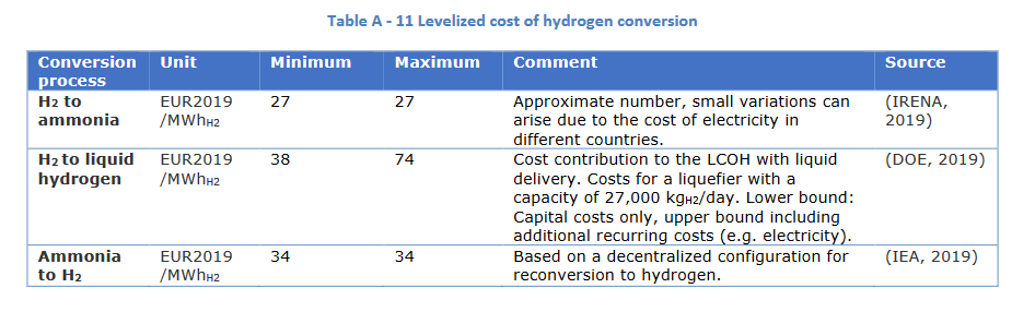 Les coûts de l'hydrogène importé sont ici au mieux autour de 100 €/MWh (~3,3 €/kg), avec des hypothèses optimistes sur le coût des pipelines.