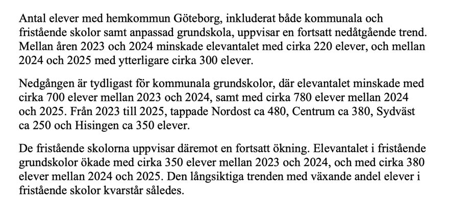 Antalet elever i kommunal skola minskade med 780 elever mellan 2024 och 2025, men antalet elever i fristående skolor ökade 380 elever. Och? Folk får väl välja själv, vad är problemet?
