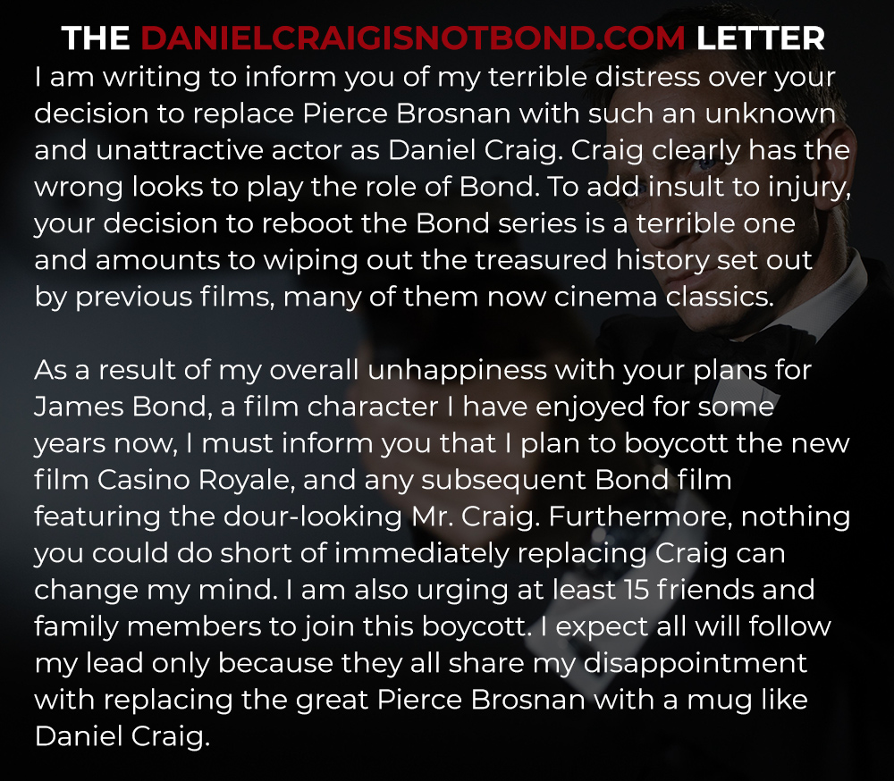 A website (danielcraigisnotbond) was set up with a downloadable complaint letter to sign and send to Eon. It said “I am voicing my dissatisfaction that you have replaced Pierce Brosnan with such an unknown and unattractive actor.” (Full letter below).