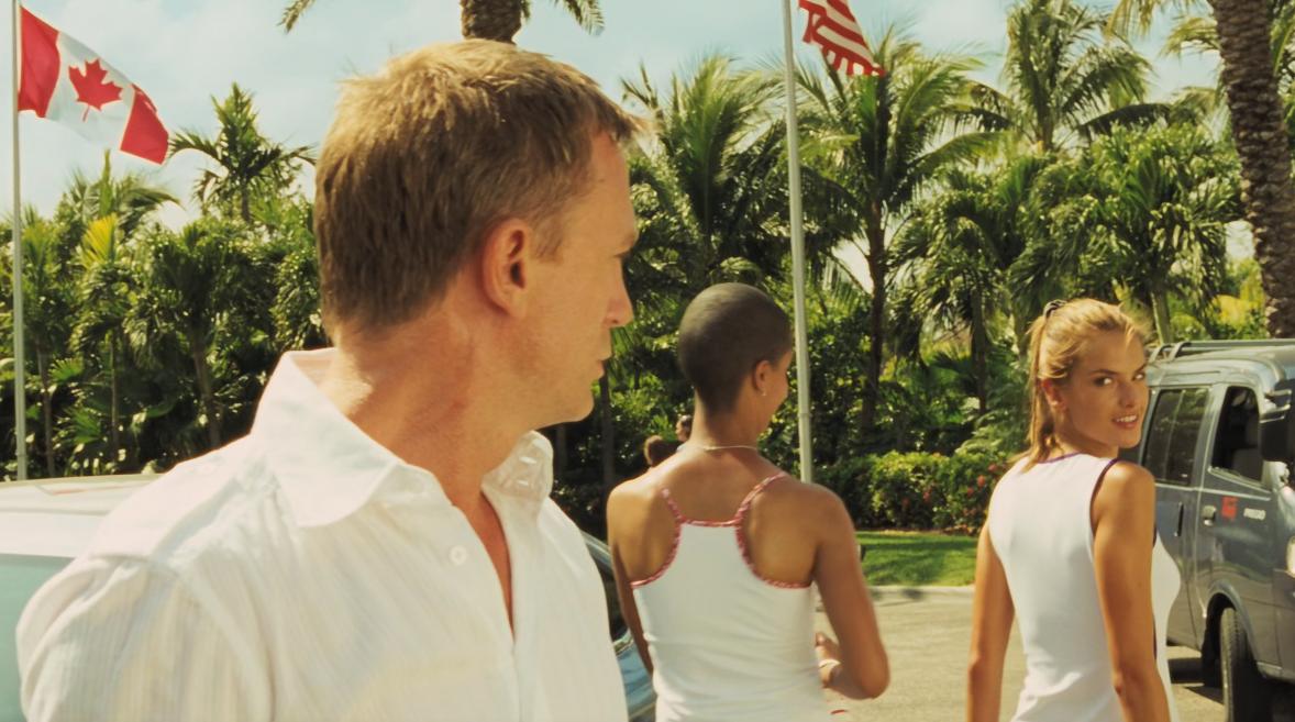 There’s a couple of quick cameos. The girl in the tennis outfit who smiles at Bond in the Bahamas is Brazilian supermodel Alessanra Ambrosio. And Richard Branson shows up at the airport. He was a Bond fan and asked for a cameo in return for letting one of his planes appear.