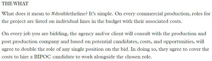 Meta was producing a TV commercial with the ad agency BBDO and the production company Something Ideal, Inc. AICP’s members are responsible for 80-85% of all motion picture ads in the United States. The AICP created the Double the Line program, which creates extra positions on set only for “BIPOC” individuals.