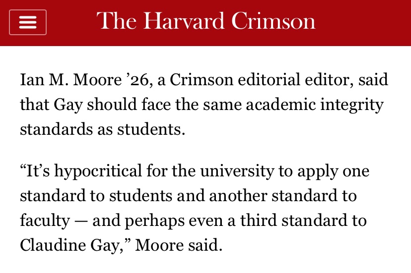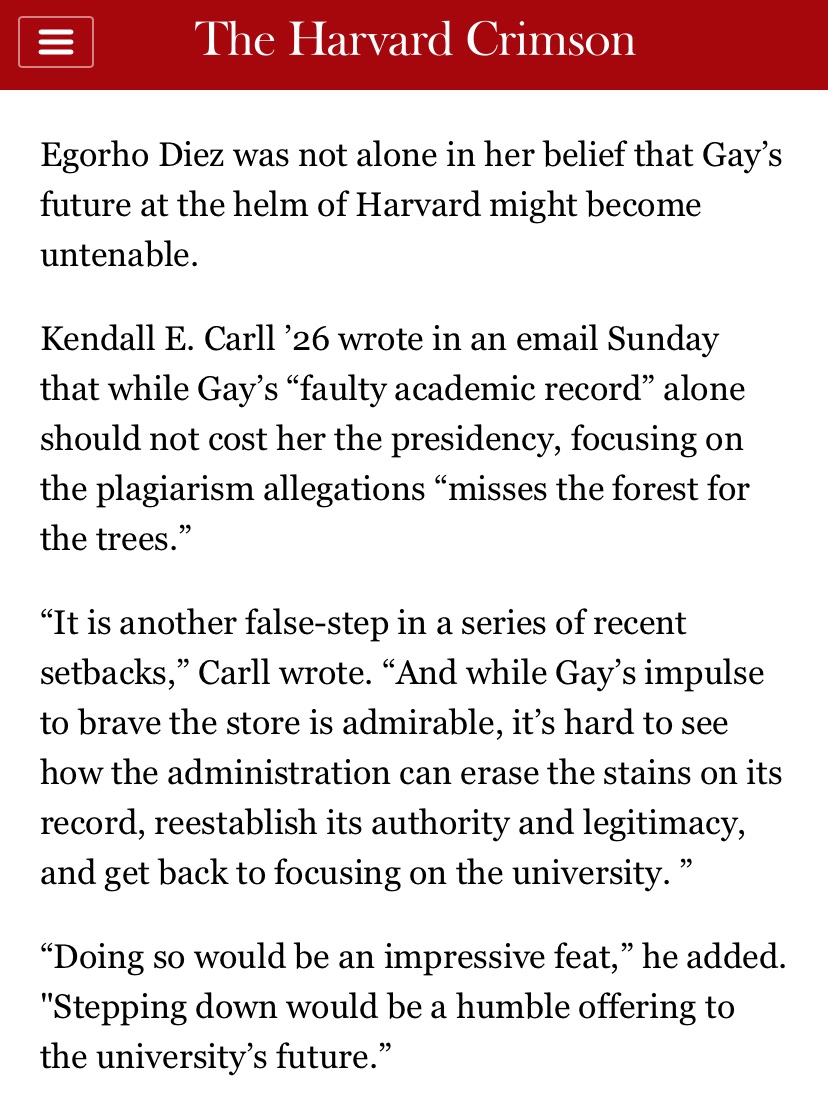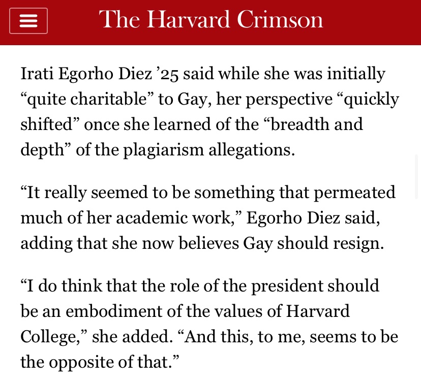 In this new Crimson piece, several Harvard students are quoted saying, basically, that Claudine Gay has to go.