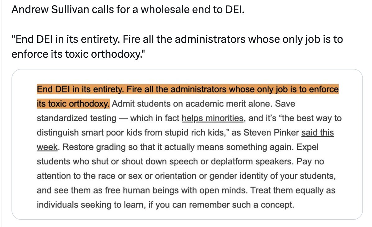 @FareedZakaria @bariweiss @sullydish 1. For @bariweiss, I started the year with “How DEI Is Supplanting Truth as the Mission of American Universities.”