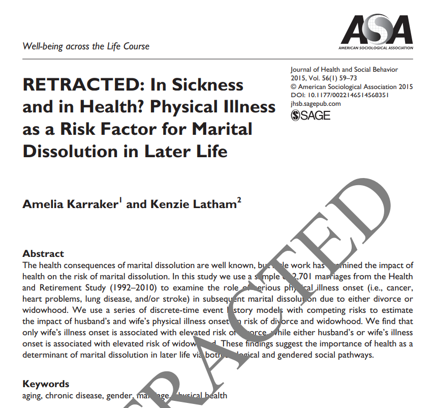 A widely reported 2015 study purported to show that men are highly likely to divorce their wife if she falls sick. However, it was actually retracted quickly by the authors themselves because of one serious error: