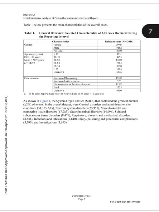 Op 28.02.2021 had Pfizer zelf namelijk al 1.223 doden geregistreerd door .... het vaccin evenals een grote hoeveelheid ernstige bijwerkingen in alle leeftijdscategorieën waarvan 11.361 niet waren hersteld op het tijdstip van de redactie van haar rapport per 30.04.201 en 19.582 hersteld of nog herstellende waren. ( zie screenshot hieronder )