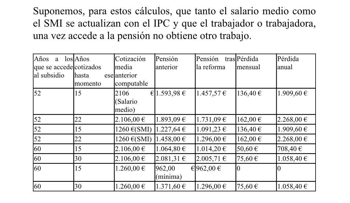 8- Por ejemplo un trabajador que acceda al subsidio a los 52 años, tenga 22 cotizados a una media del salario medio, si lo cobra hasta los 67 años perderá 162 € al mes