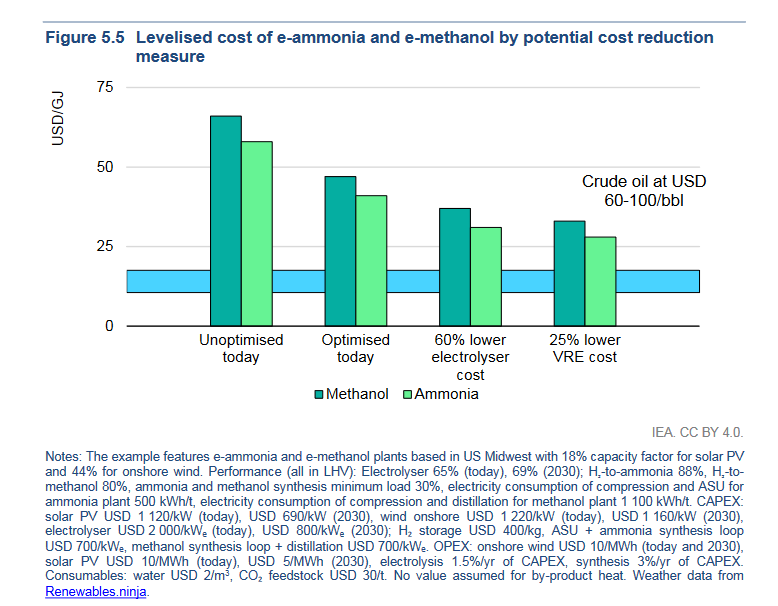 Les e-fuels sont chers à produire. L'AIE espère à l'horizon 2030 des coûts cibles de 700 $/t pour l'e-méthanol et 550 $/t pour l'e-ammoniac, soit au-dessus de leurs contrefactuels fossiles, et de 2 150 $/t pour l'e-kérosène, à parité avec les biocarburants avancés (SAF).