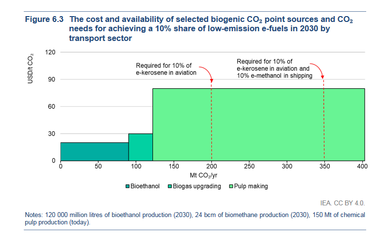 200 Mt de CO2 biogénique sont nécessaires pour l'objectif de 10% d'e-kérosène, et 150 Mt pour un objectif de 10% d'e-méthanol.