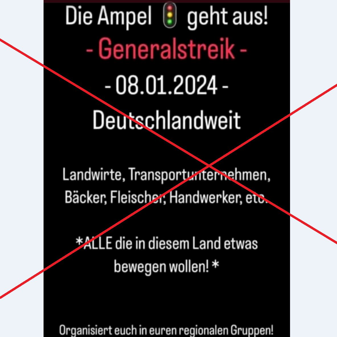 ..Schon seit einigen Tagen ist das Netz voll mit Aufrufen auf Sharepics, die, meist ohne Impressum und mit den bildlichen Stilmitteln der 40er-Jahre des letzten Jahrhunderts für den 8. Januar zu "Generalstreik" und Umsturz aufrufen