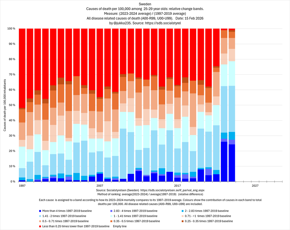 In this thread, I take all disease-related causes of death for each age group in Sweden and assign them to growth bands based on how much above or below the 1997-2019 baseline they are. Here are 25-29 year olds. 2/x