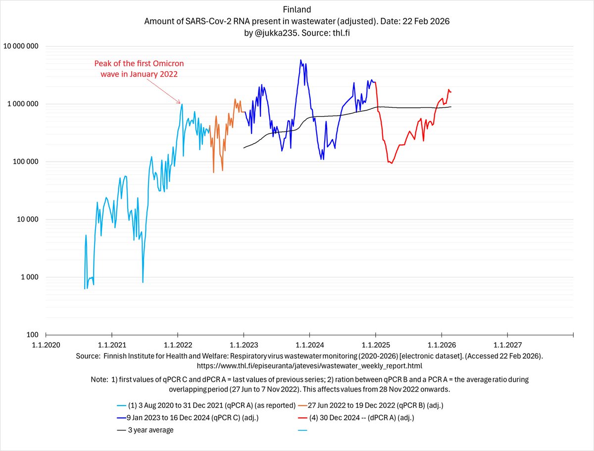 Finland's epidemic 22 Feb 2026: the amount of virus detected in wastewater is now 60% higher than during the first Omicron wave in 2022. The post-Omicron baseline appears permanently higher compared with the pre-Omicron period; repeated waves show no sign of diminishing. 1/x