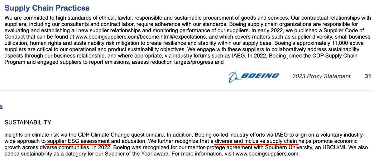 Boeing didn't just mandate DEI at Boeing. Italso prioritized ESG and DEI in their supply chain, as with ESG agendas, which suggests they did not look for the best suppliers on quality and safety on objective metrics, but focused on meeting their ESG goals instead.