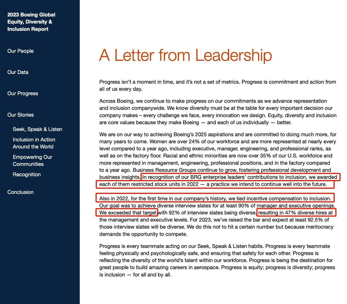 It gets worse. The 2023 Boeing DEI/GEDI report is proud of how they tied executive compensation to DEI, not meritocracy and excellence regardless of race/identity. In fact they gave "Business Resource Groups" stock awards for their "contributions to inclusion." Corruption.