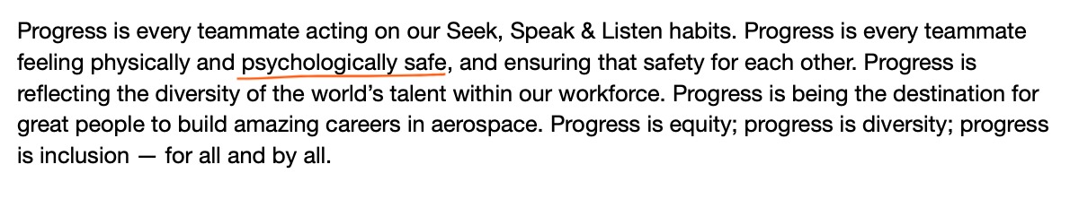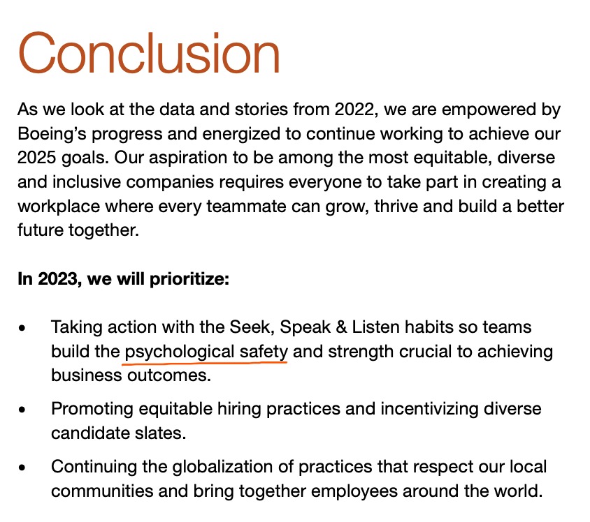 Further, when Boeing exes talk about safety in corporate documents, they often don't mean passenger safety but the "psychological safety" of employees, like in their DEI/GEDI report. These kinds of tricks are commonplace with that word. Read carefully.