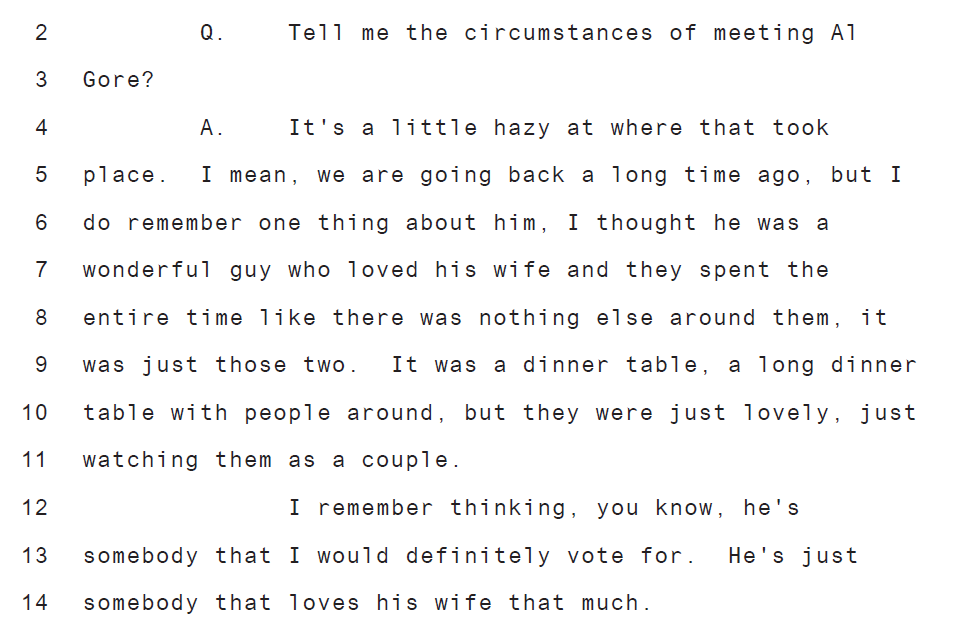 Al Gore is a lovely wife guy, according to Jeffrey Epstein accuser Virginia Giuffre in a newly unsealed deposition.