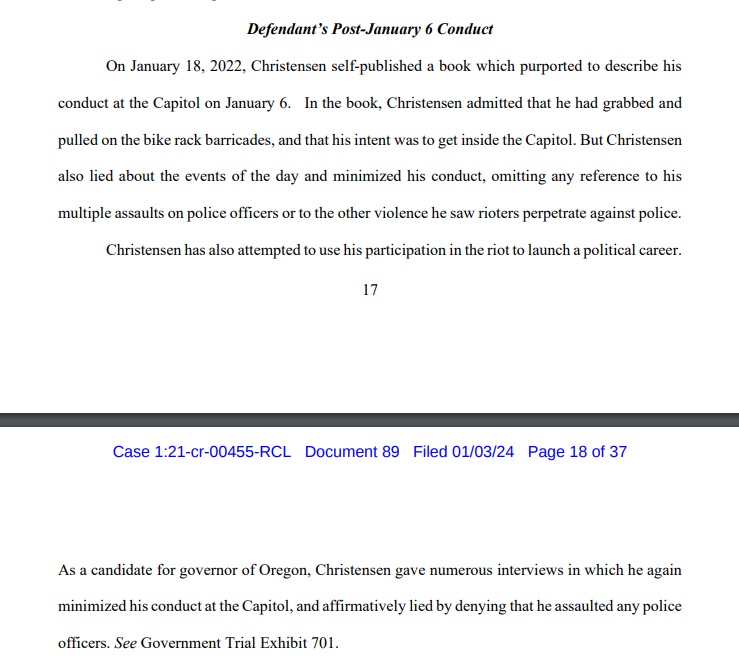 TODAY: Feds seek 5-years prison for Jan 6 defendant Reed Christensen, accusing him of charging police & saying he's used the "riot to launch a political career. As a candidate for governor of Oregon, Christensen gave numerous interviews in which he.. minimized his conduct.."