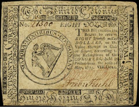 Vůbec první papírové peníze autorizované vládou v západním světě byly vydány v r.1690 v kolonii Massachusetts. Ta tím financovala vojenskou expedici do Kanady. Postupně si všech 13 amer. kolonií pořídilo vlastní měnu, navzdory Londýnu. Akceptovaly i španělskou a franc. měnu.