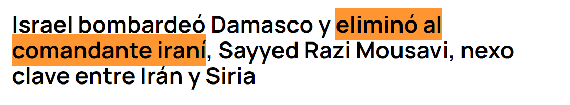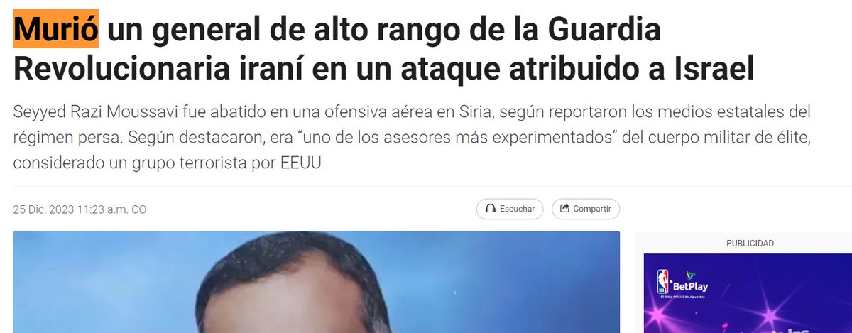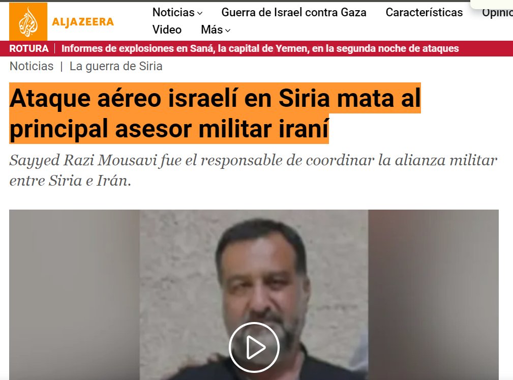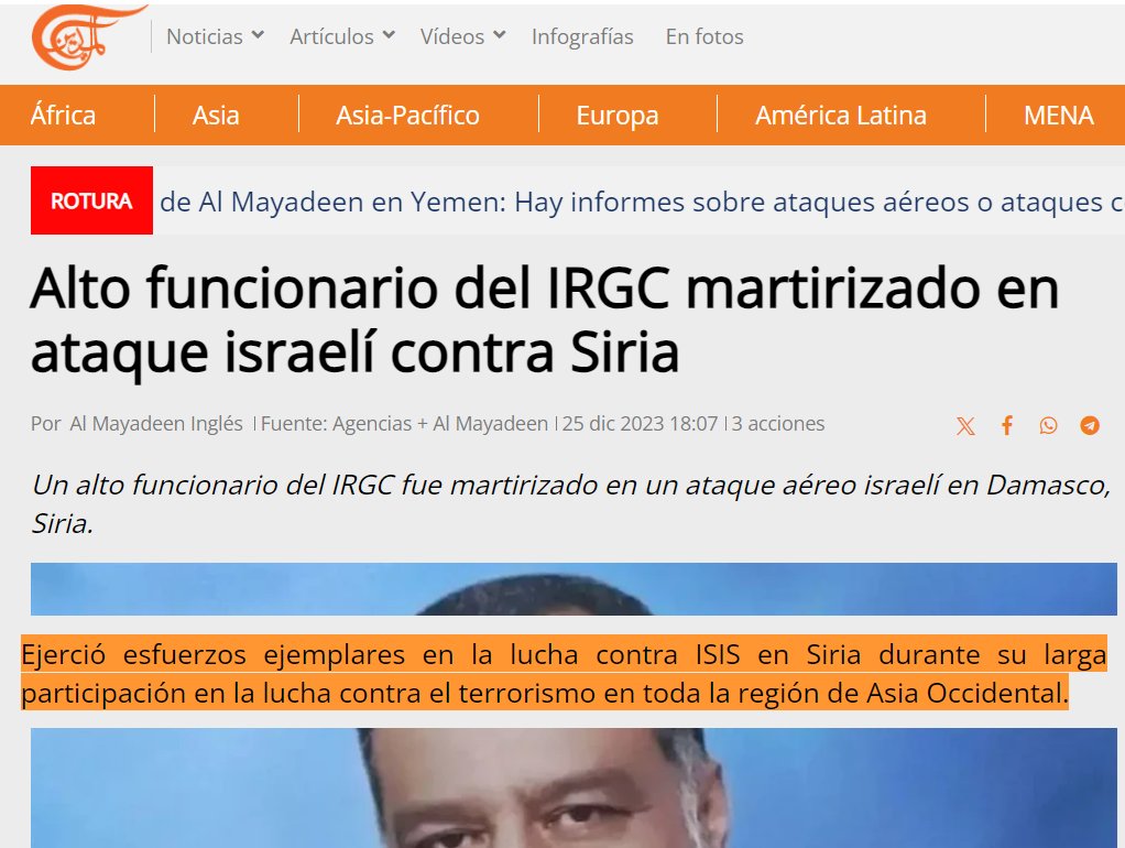 "Un ataque israelí en afueras de Damasco, la capital de Siria mató a un alto asesor miembro de las Fuerzas Revolucionarias de Irán".