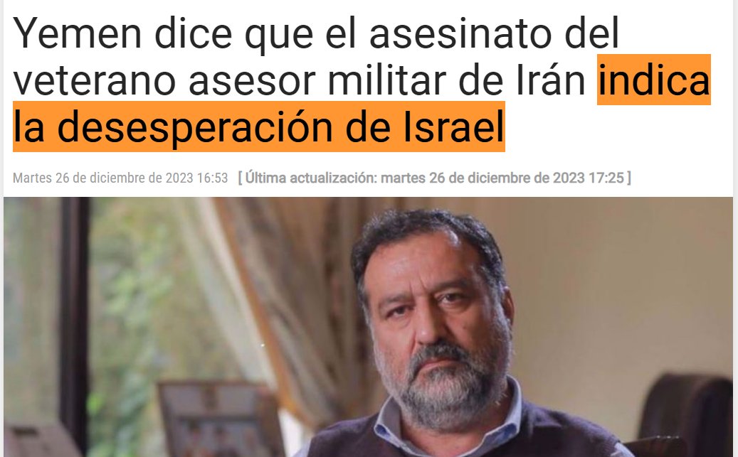 "Yemen interpreta el asesinato del asesor militar iraní como un acto desesperado de Israel".