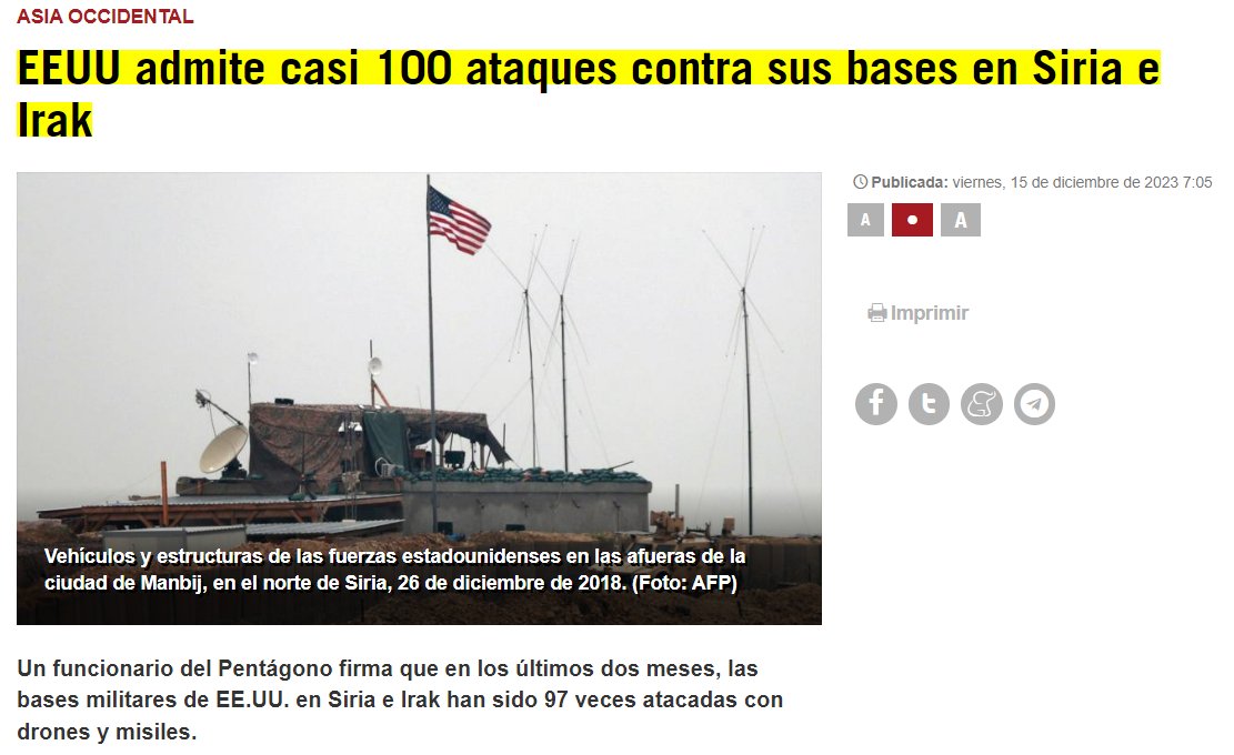 "EE. UU. reconoce cerca de 100 ataques a sus bases en Siria e Irak", como respuesta al respaldo a los bombardeos israelíes en Gaza con armamento estadounidense.