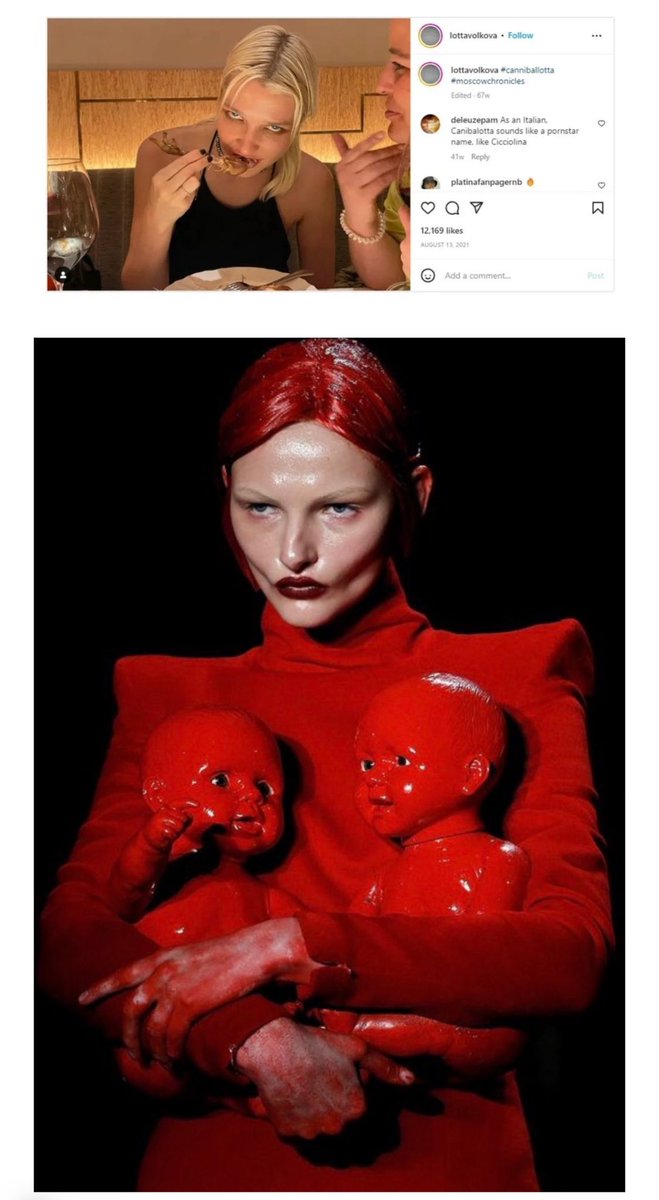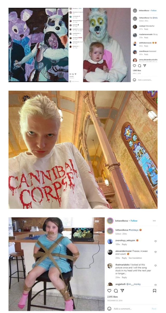 Upon further digging, Internet sleuths discovered that some of the women behind Balenciaga’s ad campaigns openly promote on their social media images glorifying Satanism, occult blood rituals, child abuse and cannibalism. For instance, the fashion empire’s stylist, Lotta Volkova, has an Instagram account littered with stomach churning, demonic garbage and many of the photos depict child torture. There are photos of white rabbits terrorizing children. In one photo Volkova is in a church wearing a long-sleeve shirt that reads “Cannibal Corpse”.