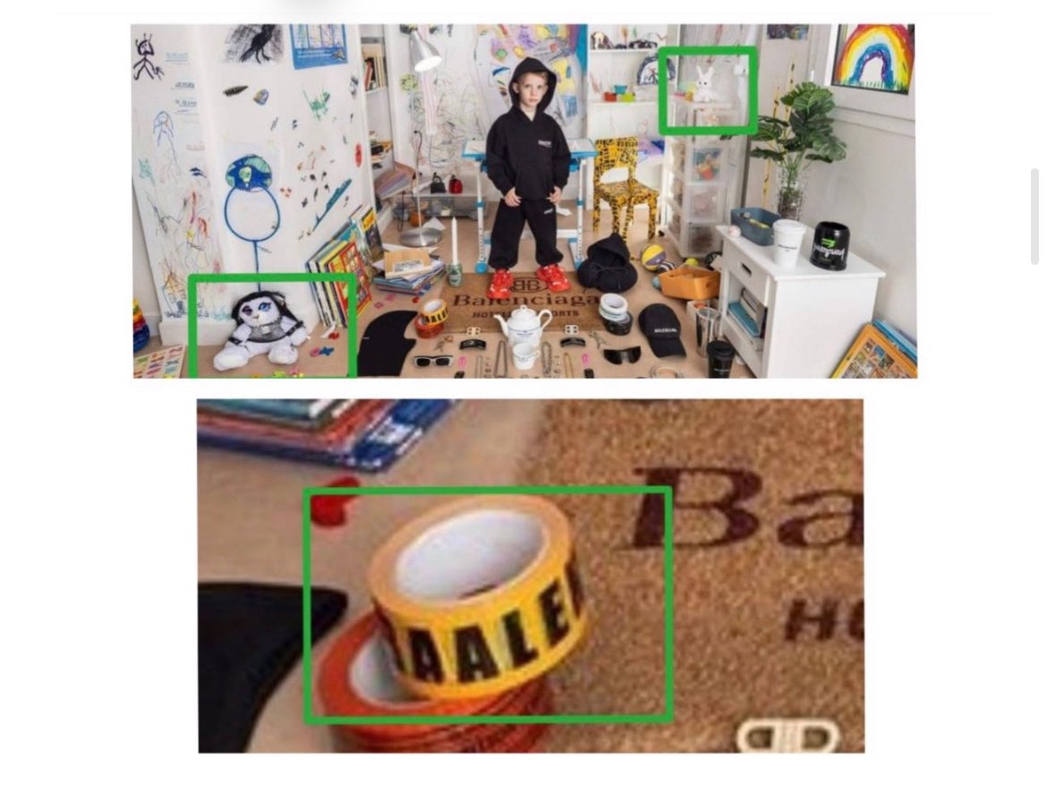 Furthermore, a video from a Balenciaga campaign shows bloodied baby dolls in a Balenciaga bag. In another image, there is yellow tape on the floor and Balenciaga is spelled “BAALENCIAGA”. It also is important to note that models for Balenciaga’s fashion shows have walked the runway made to look like domestic violence and/or trafficking victims covered in blood and bruises.