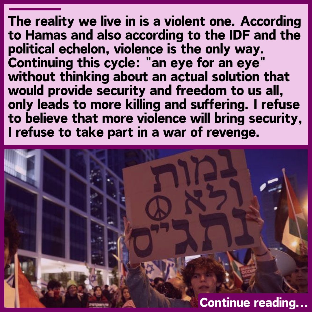 "Continuing this cycle: "an eye for an eye" without thinking about an actual solution that would provide security and freedom to us all, only leads to more killing and suffering. I refuse to take part in a war of revenge"