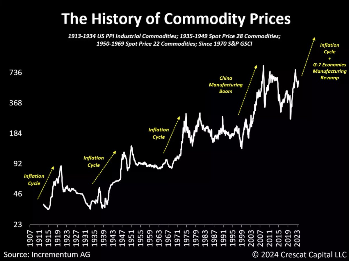 Courtesy of our friends at Incrementum AG, the following chart gives us an insightful historical perspective. Since the 1900s, we have had four notable commodity cycles. Three of them occurred during inflationary periods: the 1910s, 1940s, and 1970s.