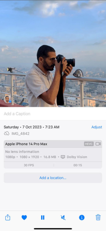 He is wearing a white striped shirt, taking photos from a roof in Gaza.