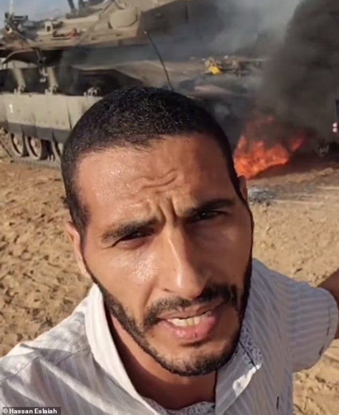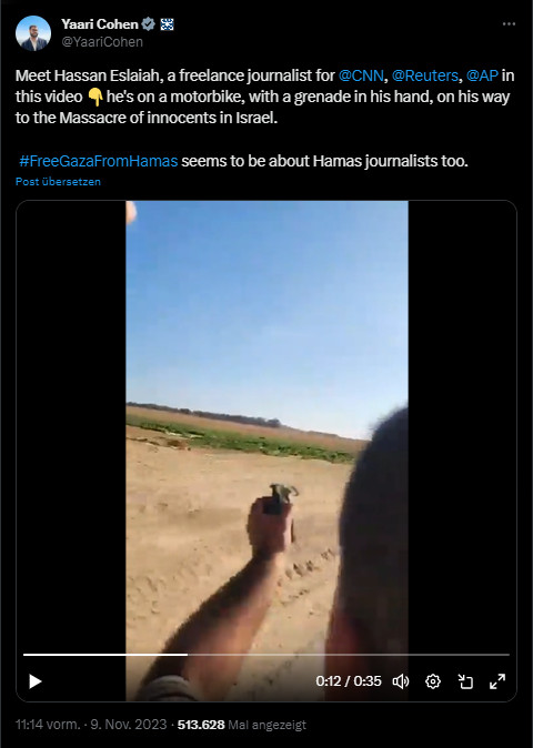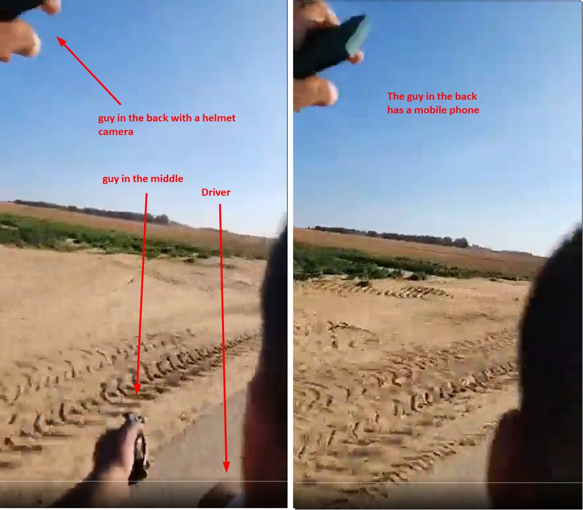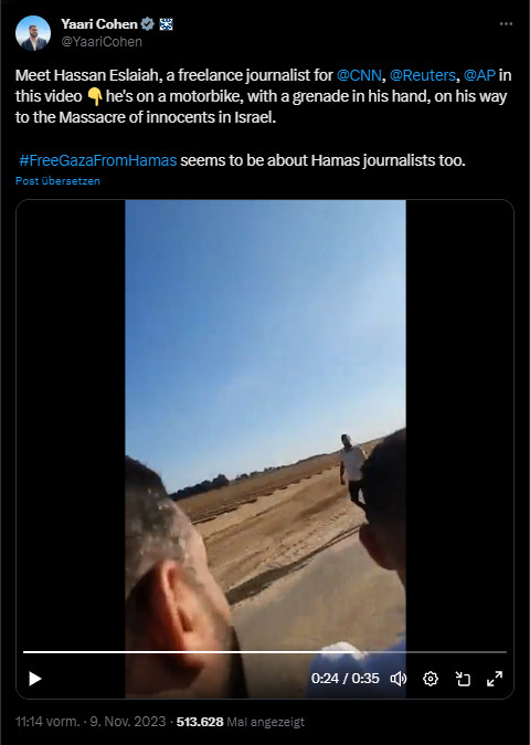 Soon he was accused of wearing a braun T-shirt holding a handgrenate. But some guy - the third on the bike - is holding a mobile phone and filming with a body cam like Hamas did. Hassan Eslaiah obviosly had no body-cam.