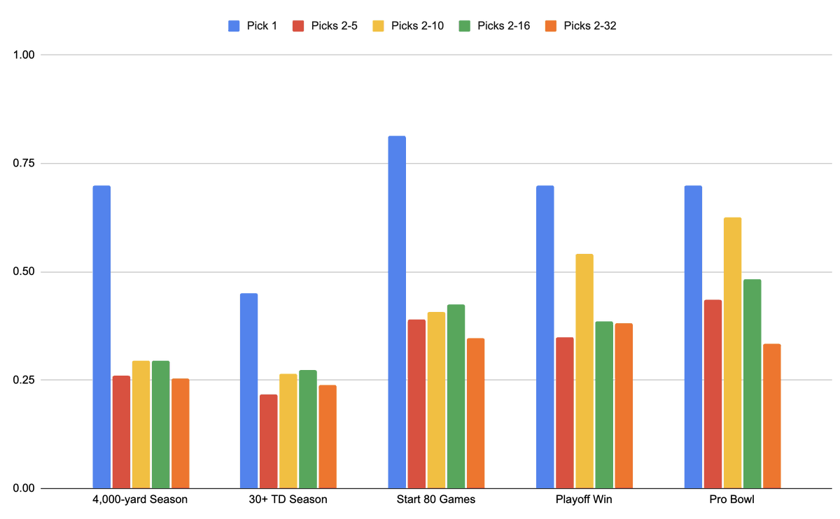 But if you want a QB who will throw for 4,000 yards and 30 TDs, make a Pro Bowl, win a playoff game, and start for 5+ years, you're most likely to get that guy at 1.01.