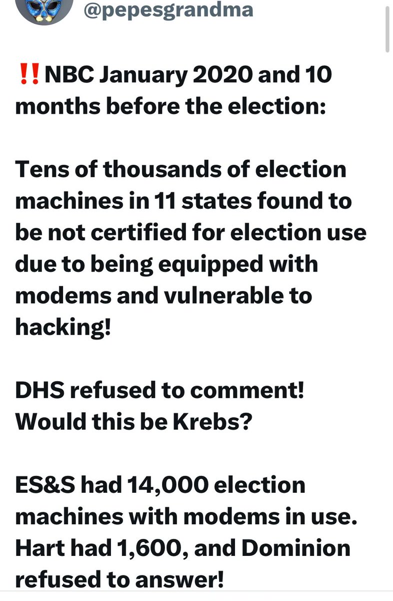 And it gets better. Chris Krebs was notified multiple times about the wireless modems and uncertified election machines, and he refused to fix the issue. The notification was by NBC in early 2020.