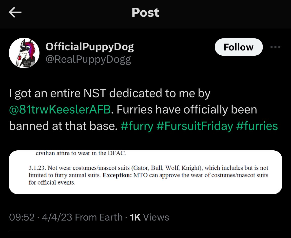 Interestingly, the @usairforce ended up firing the @81trwKeeslerAFB Commanding Officer who banned furries from base activities